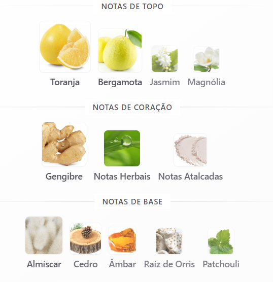 A base revela sua assinatura sofisticada: madeiras elegantes, âmbar macio e almíscar cremoso se unem para criar um rastro limpo, luminoso e profundamente sedutor, equilibrando frescor e profundidade em perfeita harmonia.